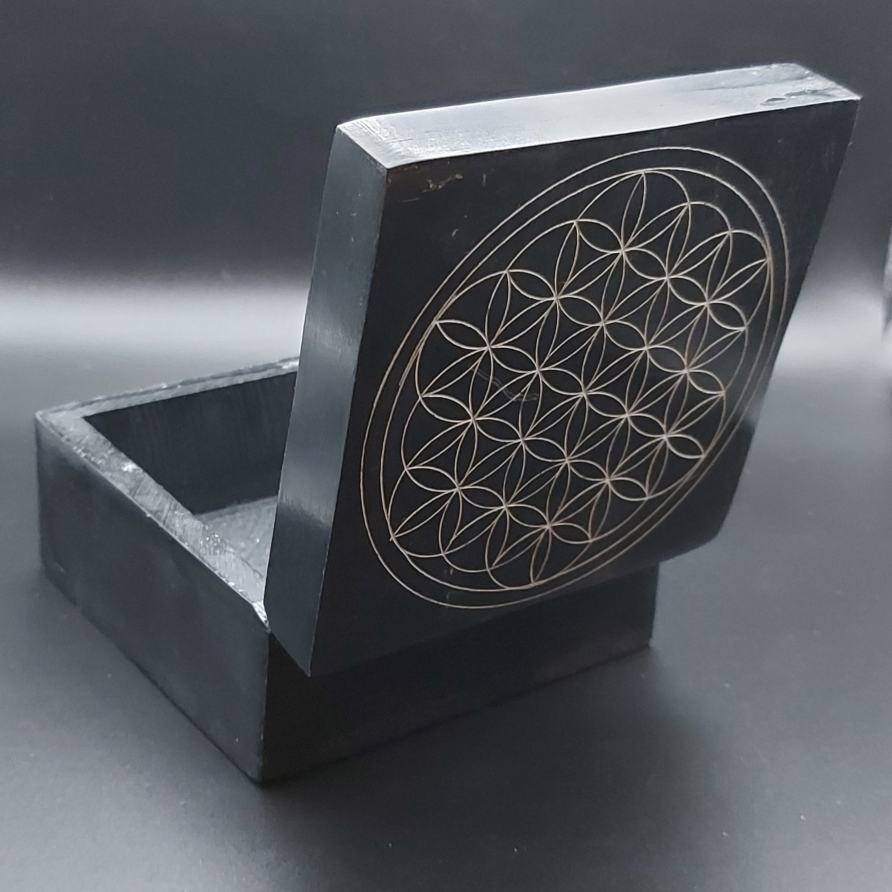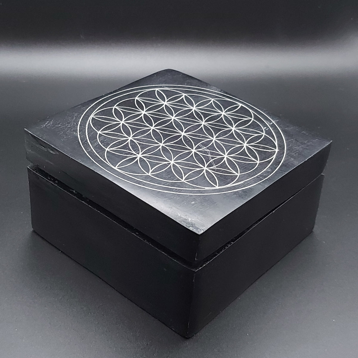 Prix unitaire / parLa boîte à bijoux carrée en saponite ornée de la fleur de vie, à la fois esthétique et symbolique, elle est parfaite pour ranger bijoux en pierres naturelles ou autres petits objets précieux, pierres roulées ou de petits galets, malas ou bracelets.